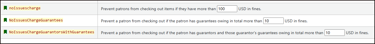 - *Dollar amount at which patron accounts are blocked.* This is a system